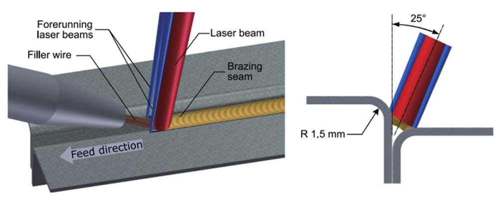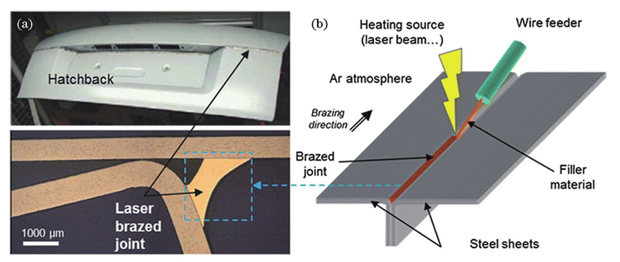 激光钎焊工艺原理如下:利用激光作为热源,激光束经过聚焦后照射到焊丝表面,焊丝熔化,熔化的焊丝滴落并填充到待焊工件之间,钎料与工件之间发生熔解和扩散等冶金效应,从而使工件实现连接。与激光填丝焊接工艺不同,激光钎焊工艺只熔化焊丝而不熔化待焊工件。激光钎焊具有良好的焊接稳定性,但得到的焊缝抗拉强度较低。图4为激光钎焊工艺在汽车行李箱盖焊接中的应用[33]。在汽车车身焊接过程中,激光钎焊工艺主要是焊接对接头强度要求不高的车身部位,如车身的顶盖和侧围之间的焊接、行李箱盖上下部之间的焊接等,大众、奥迪等中高端车型的顶盖均采用激光钎焊工艺。