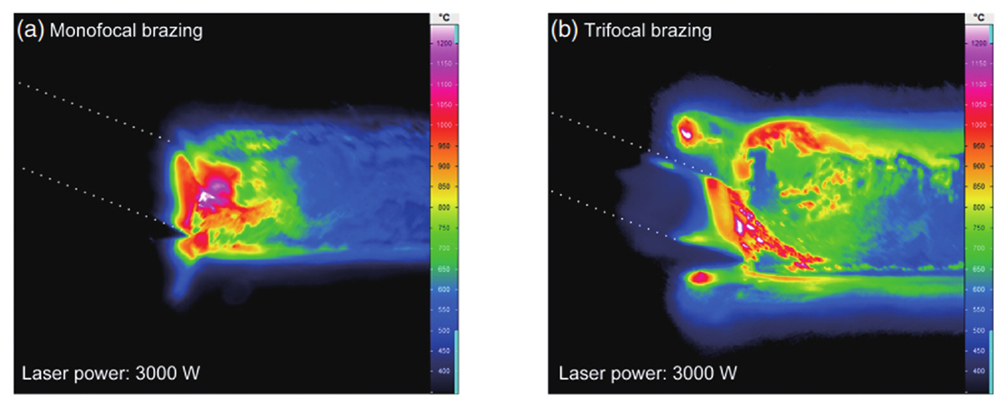 目前,光纤激光器可利用安装在焊接头中的分光模块将单束激光分为多束激光。多激光束焊接相当于在焊接过程中施加多个热源,通过调节光束的能量分布,不同光束可实现不同的功能,如:能量密度较高的光束为主光束,负责深熔焊接,能量密度较低的分光束可以对材料表面进行清洁和预热,增加材料对激光束能量的吸收。本文2.1节和2.3节展示了多激光束焊接工艺在汽车车身激光深熔焊和激光钎焊中的部分研究成果,证明了多激光束焊接工艺用于汽车车身焊接的可行性。汽车车身大量使用镀锌高强钢材料,多激光束焊接工艺能改善镀锌钢板焊接过程中锌蒸气的蒸发行为和熔池的动态行为,改善飞溅问题,提升焊缝的抗拉强度。