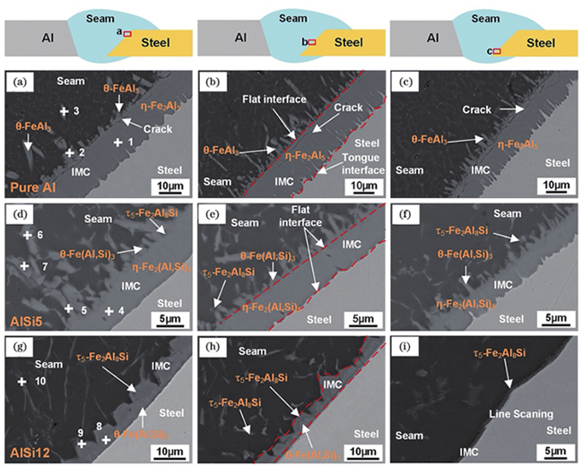 随着汽车车身顶盖和侧围材料逐渐由单一材料向异种材料转变,异种材料的激光钎焊工艺得到了广泛关注。以汽车车身常见的铝合金-钢异种金属焊接为例,Xia等认为,不同的保护气体对铝合金-钢的激光钎焊质量有显著影响。研究发现,在保护气体中加入CO2能显著提升熔融钎料的润湿性,同时使IMC变厚,原因是CO2使激光能量吸收率增加,进而影响熔融钎料的能量分布和流动形态,最终提升了焊缝抗拉强度。此外,当钎料中的Si含量不同时,铝合金-钢的激光钎焊质量不同,AlSi5钎料焊接产生的焊缝具有最高的拉伸强度。利用不同Si含量的钎料所获得的接头在选定区域的微观结构如图7所示。Si元素的加入降低了IMC对界面峰值温度变化的敏感性,抑制了Fe-Al IMC的生长,改变了界面反应机制。双光束激光钎焊工艺为汽车车身异种金属焊接提供了新方法。Yuan等对铝合金-钢异种金属进行了双光束激光钎焊实验,研究表明,在双光束条件下,调节激光功率可以显著改变Al和Fe反应界面的润湿性,进而改变IMC层厚度,最终影响焊缝抗拉强度和断裂形式。