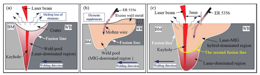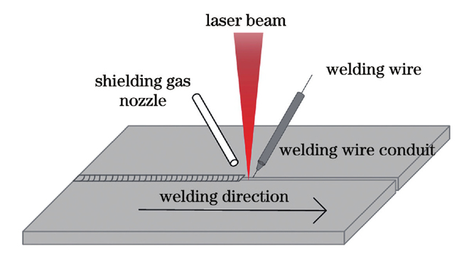 激光填丝焊接工艺原理如下:通过在焊缝中预先填入特定焊丝或在激光焊接过程中同步送入焊丝来形成焊接接头。相当于在激光深熔焊时向焊缝熔池中输入近似同质的焊丝材料。激光填丝焊工艺的示意图如图3所示。相比激光深熔焊,激光填丝焊在汽车车身焊接方面有两个优势,一是可大幅提升待焊汽车车身部件之间装配间隙的容忍度,解决激光深熔焊对坡口间隙要求过高的问题;二是可以通过使用不同成分含量的焊丝来改善焊缝区域的组织分布,进而调控焊缝性能。在汽车车身制造过程中,激光填丝焊工艺主要用于焊接车身铝合金和钢材部件。特别是在汽车车身铝合金部件的焊接过程中,熔池表面张力较小,易导致熔池下塌,而激光填丝焊工艺在激光焊接过程中通过焊丝的熔化可较好地解决熔池塌陷问题。
