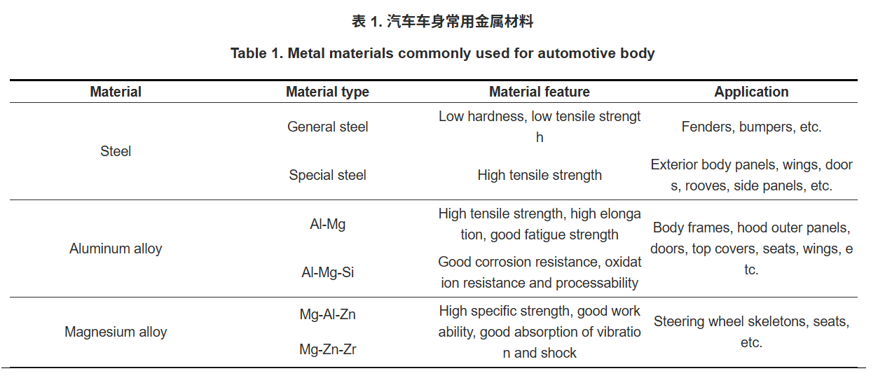 汽车车身主要由两大部分组成,分别是车身框架和车身蒙皮。其中,车身框架主要包括上边梁、下边梁、纵梁、横梁、立柱等部件,车身蒙皮主要包括顶盖、侧围、隔板、翼子板、前后车门盖等部件。将车身框架部件和车身蒙皮部件焊接在一起,即可形成完整的汽车车身。在当前主流汽车制造过程中,车身材料仍主要使用金属材料,主要包括钢、铝合金、镁合金等,此外复合材料有少量的应用[14–17]。汽车车身各部件常用金属材料如表1所示。