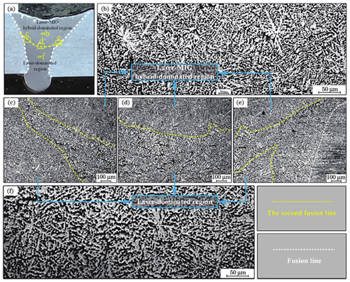 汽车车身激光-电弧复合焊接工艺相比单激光焊接工艺更加复杂,激光、电弧双热源对焊接过程的复合作用成为研究热点。张国瑜认为激光与电弧的相对位置对焊接质量有显著影响,并研究了A6082车用铝合金激光-MIG复合焊接工艺,研究发现,激光引导电弧形式下的焊缝成形美观,而电弧引导激光形式下的焊缝不连续,焊缝表面呈黑色,如图9所示。Yang等使用激光-TIG电弧复合焊接工艺,实现了汽车车身常用镀锌高强钢的搭接接头无间隙焊接,焊接过程采用TIG电弧在前、激光束在后的形式,与单激光焊接得到的焊缝相比,其焊接缺陷明显减少,焊缝力学性能得到提升。当激光在前、电弧在后时,激光对电弧有稳定的作用,焊接过程相对稳定;当电弧在前、激光在后时,电弧对材料进行预热,可以提升材料对激光的吸收率,从而增加焊缝熔深和熔宽。在激光-电弧复合焊接过程中,伴随有熔滴过渡行为,不同的熔滴过渡形式对熔池传热和流动状态有不同的影响。Chen等通过数值模拟方法建立了铝合金激光-MIG复合焊接的仿真模型。模拟结果表明,熔滴过渡形式影响熔池的传热和流体流动状态,焊缝的高度与熔滴撞击熔池的状态紧密相关。激光-电弧的复合作用相比单激光或单电弧情况更加复杂,激光-电弧复合焊接主要包含激光作用区、激光-电弧复合作用区和电弧作用区。不同区域的温度分布不同,导致激光-电弧复合焊接焊缝组织不同。Zhao等通过实验和数值模拟的方法研究了铝合金激光-MIG复合焊接不同区域的晶粒分布,结果如图10、11所示。从图10中可以看出,当激光与电弧复合作用时,熔池面积显著增大,激光-电弧复合作用区集中在熔池上部。图11对比了激光作用区和激光-电弧复合作用区的微观组织形貌,复合作用区以细小枝晶为主,激光作用区以粗大枝晶为主;复合作用区的抗拉强度高于激光作用区。