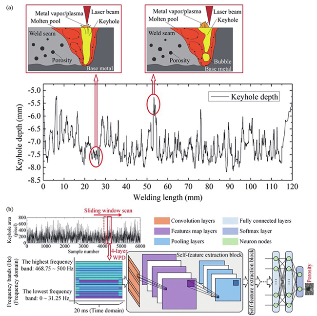 在汽车车身激光焊接过程中,焊缝缺陷在线监测的难度在于准确建立焊接过程中多元传感器信号与特定焊接缺陷之间的关系模型。Ma等针对铝合金薄板激光焊接过程中出现的气孔问题,通过提取焊接过程中的匙孔图像特征,基于卷积神经网络,建立了焊缝气孔率和匙孔信息的对应关系,识别出了焊接过程中气孔的出现位置。图14为气孔-信号-卷积神经网络(CNN)模型示意图。彭进基于X射线投射系统,实时在线监测了车用铝合金激光填丝焊过程中的熔池内部动态行为,揭示了不同送丝位置对熔池流动行为的影响,优化了激光填丝焊工艺,提高了熔池稳定性。李洁搭建了“等离子体形貌-光谱”实时监测平台,对变厚截面材料的激光焊接过程进行了在线监测,基于反向传播(BP)神经网络建立了等离子体特征和熔透状态之间的关系,实现了焊缝熔透状态的预测。Cai等通过高速摄像得到了激光焊接过程中熔池、匙孔的几何信息,并基于深度置信网络(DBN)建立了熔池和匙孔形态波动与焊缝熔深之间的关系,实现了熔透状态的实时在线监测。以上研究表明,利用人工智能算法,对焊接过程中的熔池和匙孔形态、等离子体形貌、光谱信号等的波动情况进行分析,进而对波动较大位置处的焊缝缺陷进行检测,建立缺陷和信号的关联模型,关联模型经多次训练后可以实现对特定缺陷的准确识别。