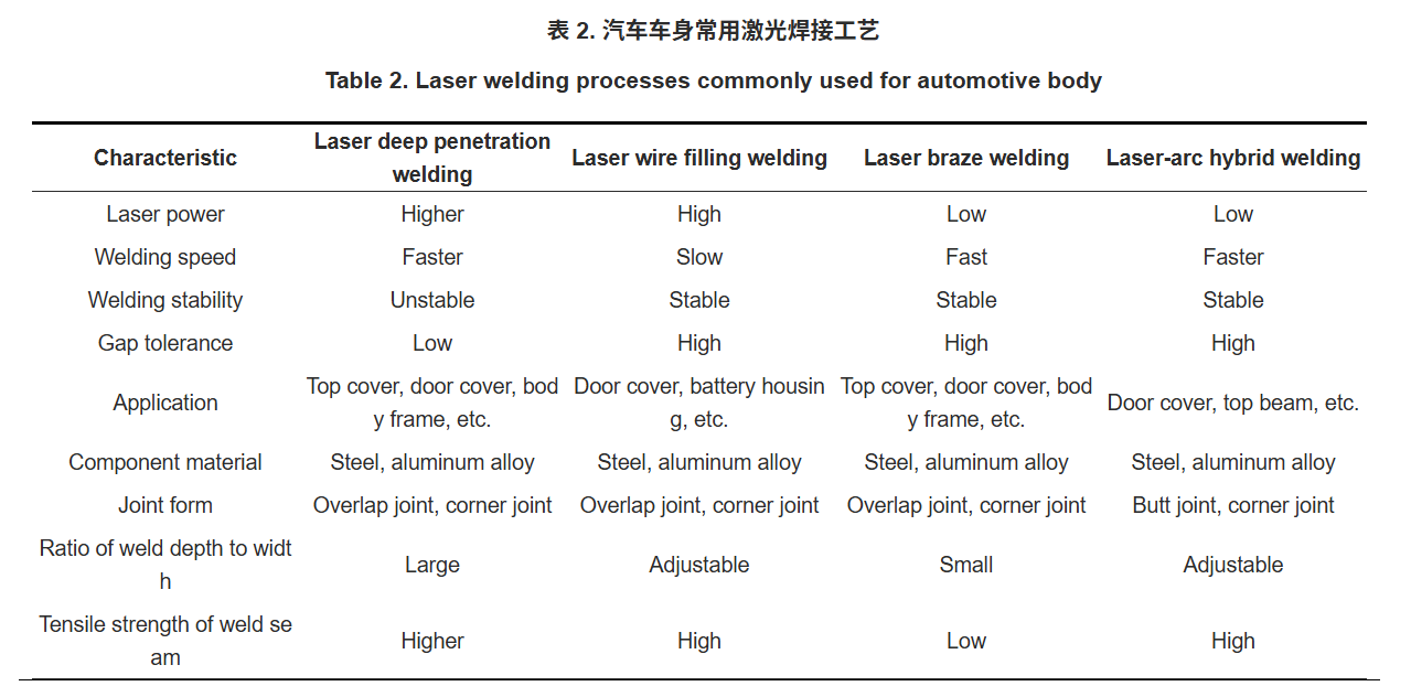在汽车车身焊接过程中,针对不同车身材料和不同接头形式,使用不同的激光焊接工艺。目前应用在汽车车身焊接领域的主要激光焊接工艺包括激光深熔焊、激光填丝焊、激光钎焊以及激光-电弧复合焊接。常用汽车车身激光焊接工艺的特点如表2所示。
