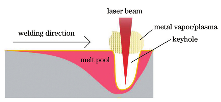 激光深熔焊工艺原理如下:当激光功率密度达到一定水平时,材料表面发生气化,从而形成匙孔;当孔内金属蒸气压力与四周液体的静压力和表面张力达到动态平衡时,激光可通过匙孔照射到孔底;随着激光束的运动,形成连续的焊缝。在激光深熔焊焊接过程中,不需要添加辅助焊剂或填料,即可将工件自身材料焊接为一体。激光深熔焊工艺的示意图如图1所示。激光深熔焊得到的焊缝一般光滑平直,变形量小,有利于提升汽车车身的制造精度;焊缝的抗拉强度较高,保证了汽车车身焊接质量;焊接速度快,有利于提高焊接生产效率。在汽车车身焊接中,激光深熔焊工艺可以满足车身组焊和拼焊的焊接需求。车身组焊主要用于车身顶盖、侧围、车门等区域的焊接,车身拼焊主要用于不同强度、不同厚度、不同涂层的钢板焊接。在汽车车身焊接过程中,使用激光深熔焊工艺可以大幅减少零件、模具及焊接工装数量,从而降低车身自重和生产成本。然而,激光深熔焊工艺对待焊部件的装配间隙容忍度较差,需要将装配间隙控制在0.05~2 mm之间,若装配间隙过大,则会产生气孔等焊接缺陷。
