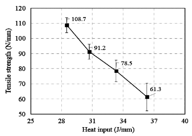 随着汽车轻量化进程的不断推进,车身异种金属的焊接需求逐渐增加,近年来关于汽车车身铝合金-钢激光深熔焊接工艺的研究取得了一定进展。由于铝合金和钢的物性参数相差较大,Al元素和Fe元素发生反应易生成脆性相,因此在对铝合金和钢进行搭接焊时,需调控Al-Fe金属间化合物(IMC)。Yuce等探究了不同热输入条件下,IMC层厚度、焊缝硬度、焊缝抗拉强度等的变化趋势。该研究表明,在实现有效焊接的基础上,通过减小热输入,可以获得力学性能良好的焊缝。从图2中可以看出,当热输入值为28.5 J/mm时,抗拉强度可以达到108.7 N/mm。然而,当不填充过渡金属时,铝合金-钢的激光深熔焊的焊缝强度难以满足使用需求。相关研究表明,在铝合金和钢之间添加过渡层能显著改善焊缝成形,提升焊缝的力学性能。在铝合金和钢之间添加合适的过渡金属有以下优势:1)减少Al元素和Fe元素的混合,改变IMC的微观结构;2)添加的金属元素可以与Al元素或Fe元素发生反应,生成非脆性化合物;3)当添加的金属元素熔点在铁和铝之间时,熔池中的温度分布更加均匀。